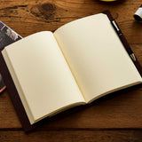 Kožené desky s vyměnitelnou náplní jsou doplněny o poutko pro psací potřeby.