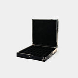 Box obsahuje kompletní šachové figurky z exotického dřeva, hrací šachové pole a úložný prostor polstrovaný sametem.