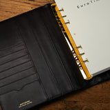 - levá vnitřní strana desek: 7 kapsiček na vizitky a karty, 3 vertikální přihrádky na poznámky