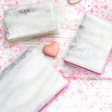 Představujeme novou úchvatnou kolekci Essence inspirovanou něžnou krásou. Zápisníky ze stříbrné zářivé kůže jsou velmi půvabné, ženské a plné sebevědomí. Zářivé doteky jemných světelných odlesků jsou v dokonalé harmonii s jemným lila interiérem. Stříbrné zápisníky jsou jako stvořené pro vaše obchodní schůzky i na speciální příležitosti. Zápisník je doplněn o praktickou kapsičku na vizitky či poznámky a podélnou kapsu po celé délce zápisníku s možností uložení poznámek a českých bankovek. Poznámkový bloček i mini propiska jsou součástí balení.