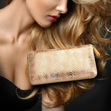Představujeme úchvatnou zlatou dámskou peněženku inspirovanou doteky italského slunce. Peněženky ze zlaté zářivé kůže jsou velmi půvabné, ženské a plné sebevědomí. Řemeslníci ANTORINI dali vzniknout mimořádné kolekci, která je ukázkou nejnáročnějšího řemeslného zpracování. Jako podšívky každé dámské peněženky byly vybrány překrásné luxusní italské moire látky. Jasné, svěží barvy s krásnými zářivými moire efekty jsou v dokonalé harmonii s interiérem každé peněženky.