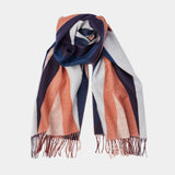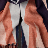Originální šála s třásněmi vyniká svým nápaditým geometrickým vzorem v kombinaci korálově červené, tmavě modré, fialové a světle šedé barvy. Ideální pro chladné dny. Ručně vyrobená s nejvyšší pečlivostí. Díky kvalitnímu zpracování ji budete moci nosit mnoho let. Vyrobeno ve Skotsku.