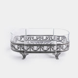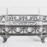 Majestátní mísa na stůl vhodná na ovoce, květinové dekorace či cukrovinky. Skleněná mísa je usazena v krásně zdobené a postříbřené dekoraci s motivem stuh a květů.