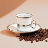 Originální porcelánový hrnek na kávu s postříbřenými dekoracemi.