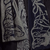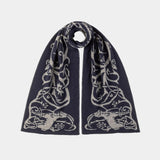 Kašmírová šála v tmavě modré barvě a šedými ornamenty.