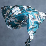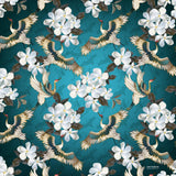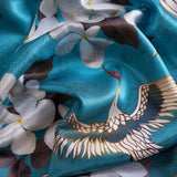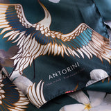 Hedvábný šátek ANTORINI Essence Legend přináší eleganci a hluboké tóny barev. Stylizovaní jeřábi a květy sakury odkazují na zemi vycházejícího slunce.
