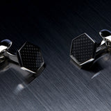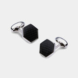 Elegantní manžetové knoflíčky ANTORINI ruční výroby z kolekce BW. Luxusní knoflíčky s originálním designem jsou vyrobeny z rhodiovaného kovu. Hexagonová část knoflíčku je zdobena karbonovým vláknem zalitým pryskyřicí.