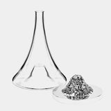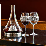 Nádherný křišťálový set dekantéru s postříbřenou základnou s dekorací a motivem vinné révy a hroznů a dvou sklenic na víno s bohatým zdobením.