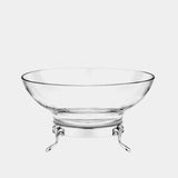 Skleněná dekorativní mísa na ovoce zdobená postříbřenou základnou a nožičkami.