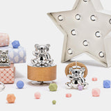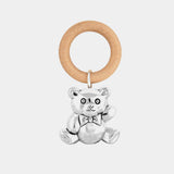 Dětské stříbrné chrastítko s medvídkem a dřevěným kroužkem.