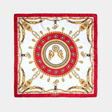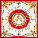 Luxusní červený hedvábný šátek ANTORINI Imperiale z limitované kolekce dekorovaný zlatými ornamenty a anděly. Tento krásný luxusní šátek pro vás vyrábíme z nejjemnějšího italského hedvábí mimořádné kvality ve městě Como v Itálii. Okraje šátku jsou ručně šité.