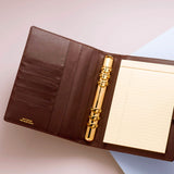 Materiál: italská bizoní a hovězí kůže, pozlacená kroužková mechanika