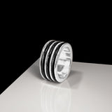 Pánský prsten vyrobený ze stříbra a kombinovaný s koženými proužky.