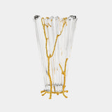 Nádherná skleněná váza s pozlacenými větvičkami. Speciálně vybrané větvičky, následně usušené a ošetřené a pro výsledný dojem pozlacené, vnáší jedinečný charakter a dotek přírody do Vašeho domova.