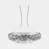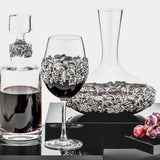 Unikátní set křišťálových sklenic, křišťálové láhve na vodu a skleněného dekantéru s masivní dekorací motivu vinné révy a hroznů.