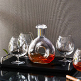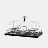 Dárkový koňakový set složený z karafy a čtyř skleniček a servírovacího tácu z černého dřeva.