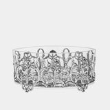 Krásná skleněná mísa s bohatou dekorací z postříbřeného kovu.