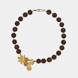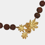 Stříbrný náhrdelník zdobený hnědými lávovými kameny a hlavním přívěskem v podobě kaštanů a listů jírovce (kaštanu).