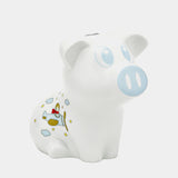 Hravá a veselá dětská kasička - prasátko s dětským motivem. Modrá verze. Okolí štěrbiny na mince zdobeno stříbrnou dekorací.
