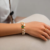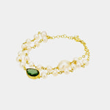 Luxusní dámský náramek z pozlaceného stříbra zdobený pravými perlami a výrazným zeleným kamenem ve tvaru kapky. Kombinace jemného perlového lesku a sytě zeleného odstínu působí elegantně a okouzlujícím dojmem. Tento šperk je dokonalou volbou pro ženy, které chtějí podtrhnout svůj styl a přidat do outfitu nádech originality i sofistikovanosti. Díky nastavitelnému zapínání se pohodlně přizpůsobí každému zápěstí.